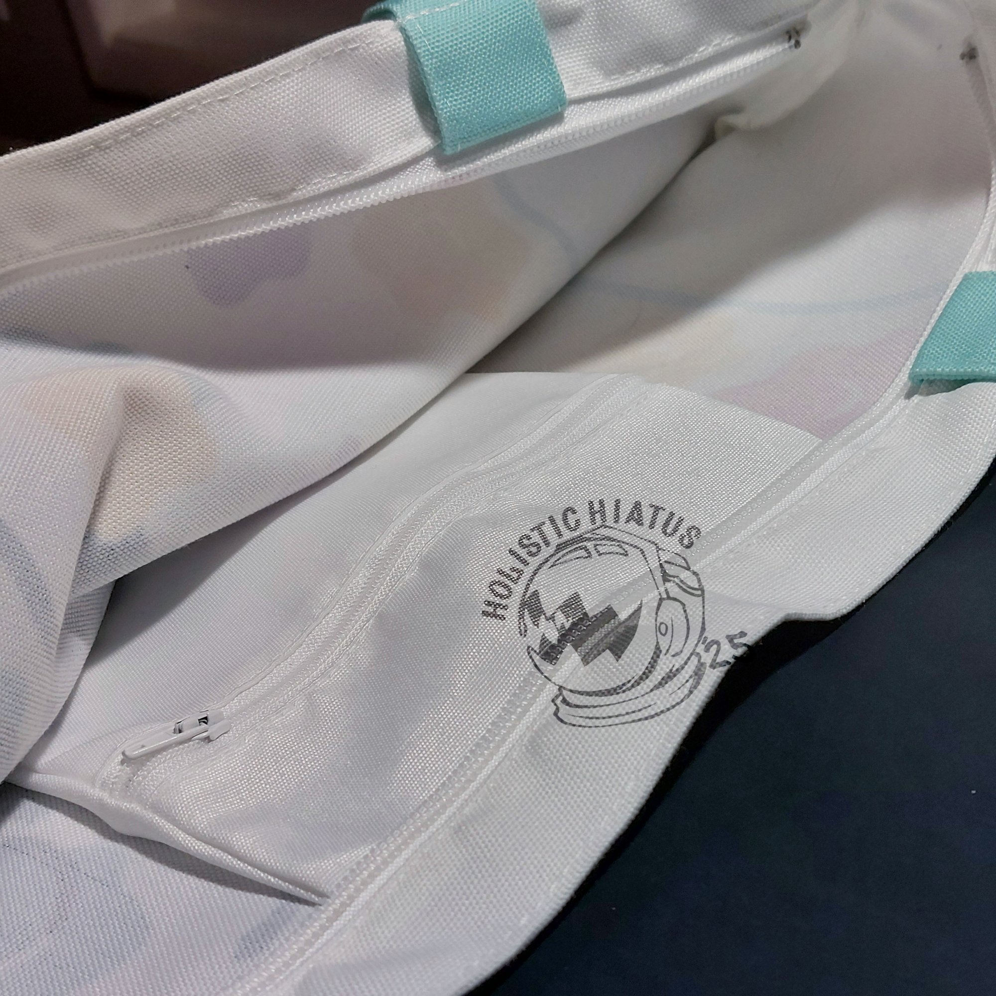 A cute tote made with durable polyester and an all over print with a zipper and inner pocket. 17.5 in wide x 13.5 in tall